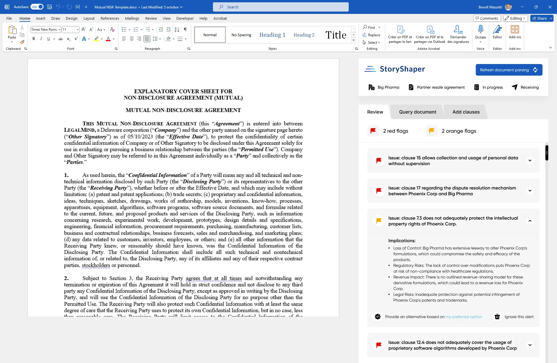 Directement depuis Microsoft Word, l'IA générative d'AutoLex analyse la conformité de vos contrats par rapport à votre clausier. Le moteur d'analyse sémantique permet de classifier automatiquement les clauses problématiques en fonction de leur niveau d'alerte.